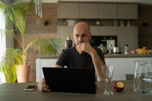 medium shot one mature adult thoughtful looking man sitting at table in livingroom, kitchen of modern european house, working at laptop notebook during covid 19 crisis, stay at home, homeoffice