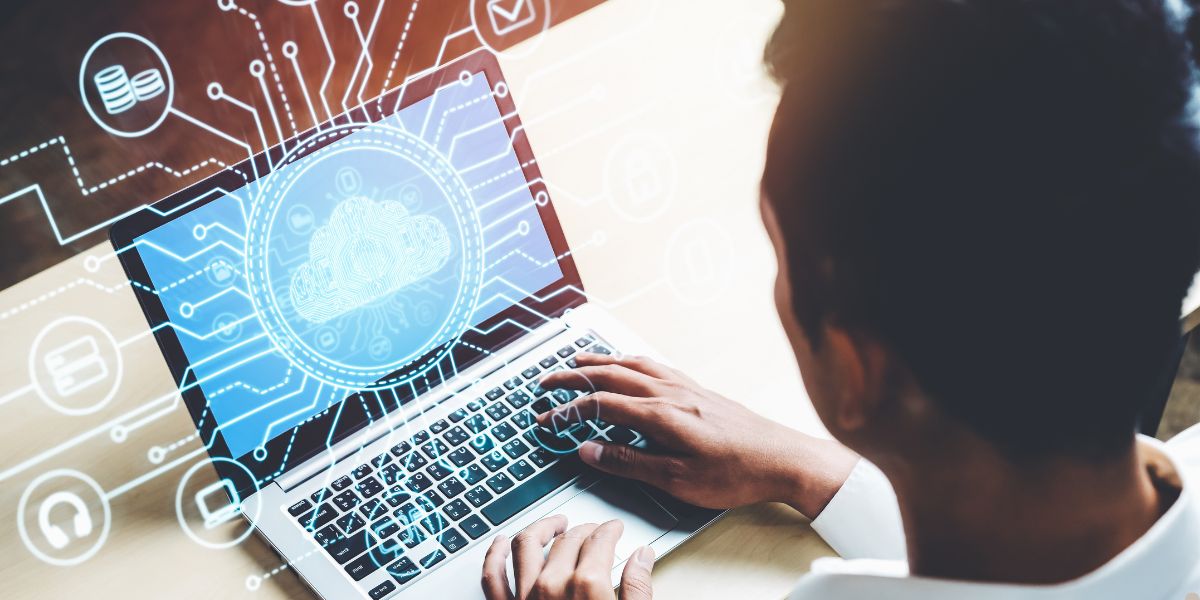 Homem utilizando notebook com ícone de nuvem e linhas que se complementam